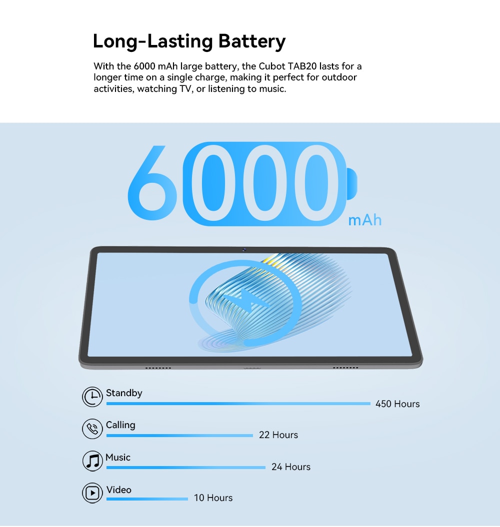 With the 6000 mAh large battery, the Cubot TAB20 lasts for a longer time on a single charge, making it perfect for outdoor activities, watching TV, or listening to music.