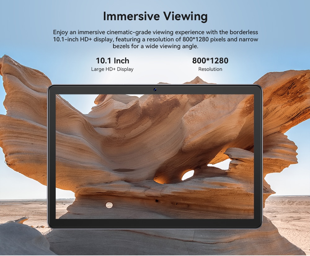 Enjoy an immersive cinematic-grade viewing experience with the borderless 10.1-inch HD display, featuring a resolution of 800*1280 pixels and narrow bezels for a wide viewing angle