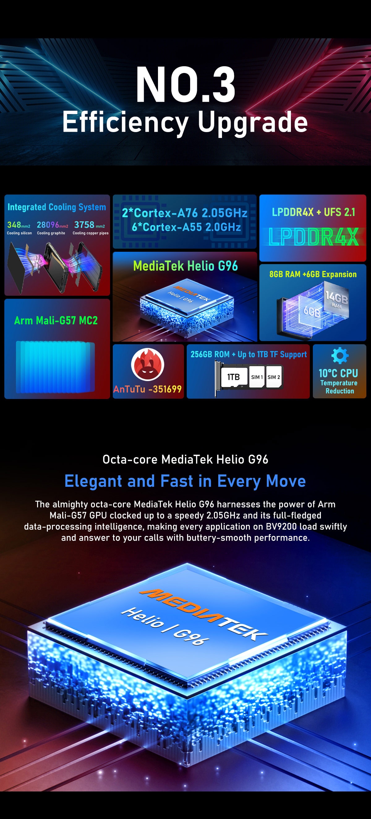 CPU -----------MTK Helio G96, Octa core, 2*2.05GHz Cortex-A76 6*2.0GHz Cortex-A55